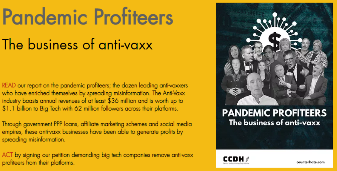 Here is part of the homepage for the Center for Countering Digital Hate Internet site at www.counterhate.com. They gererate hate statements as their major function. They are paid billions by the pharmacy companies to lie about the safety and efficacy of the vaccines.